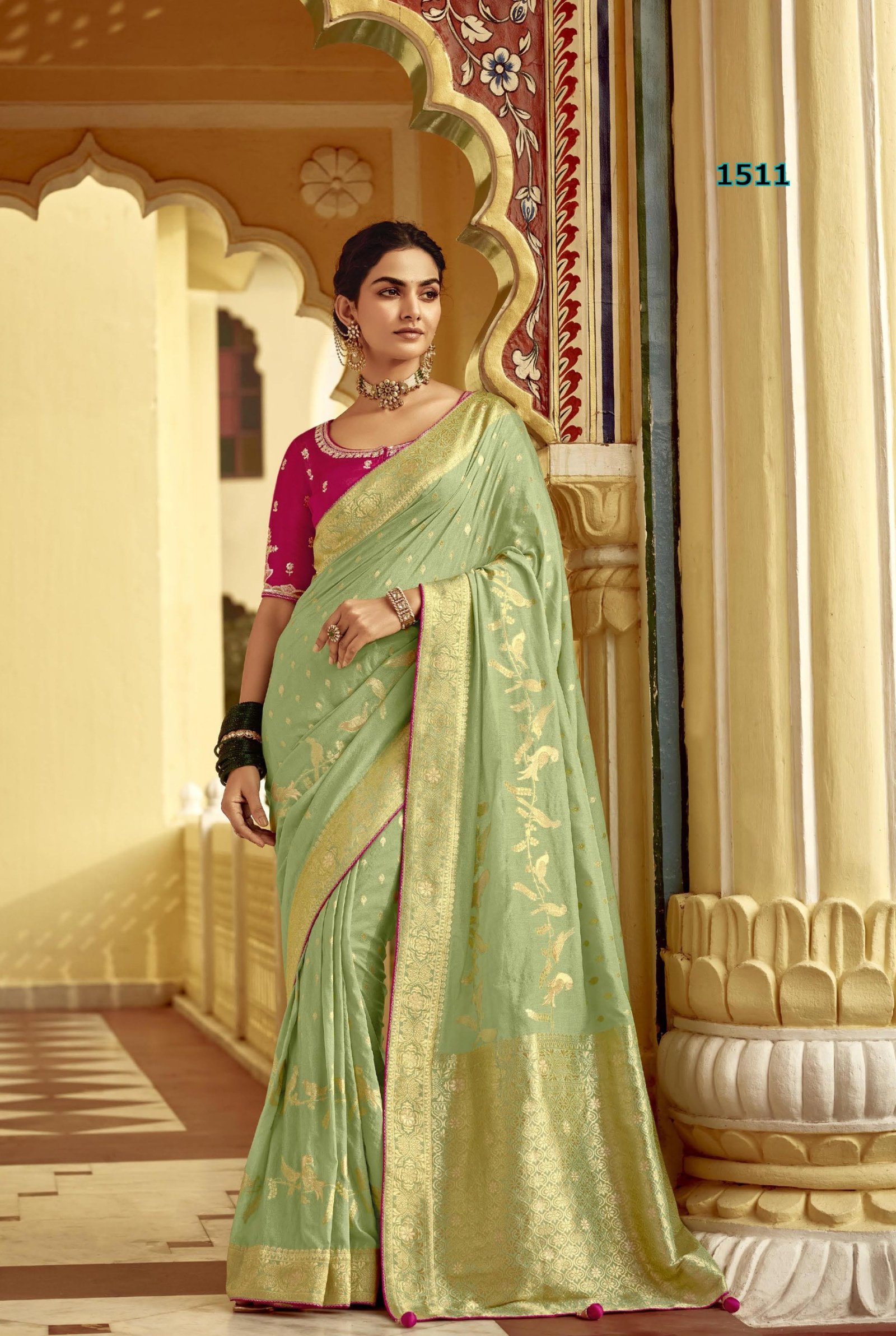 Fabric :- Pure Dola Silk With Tussles On Pallu & Designer Embroidered Fancy Blouse